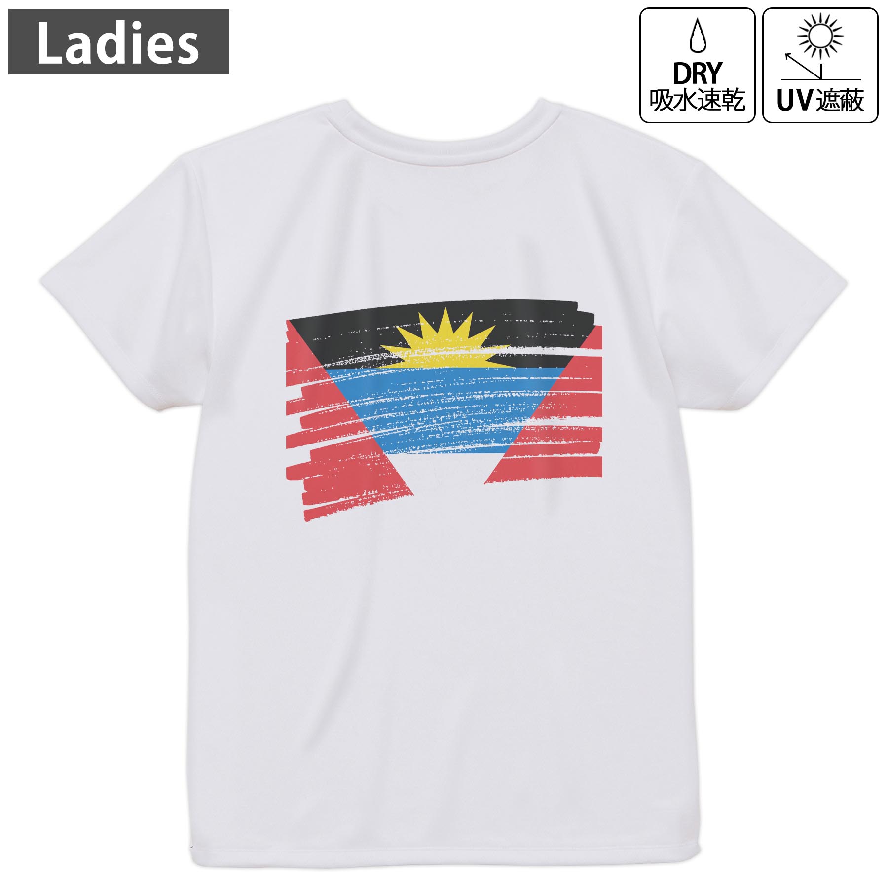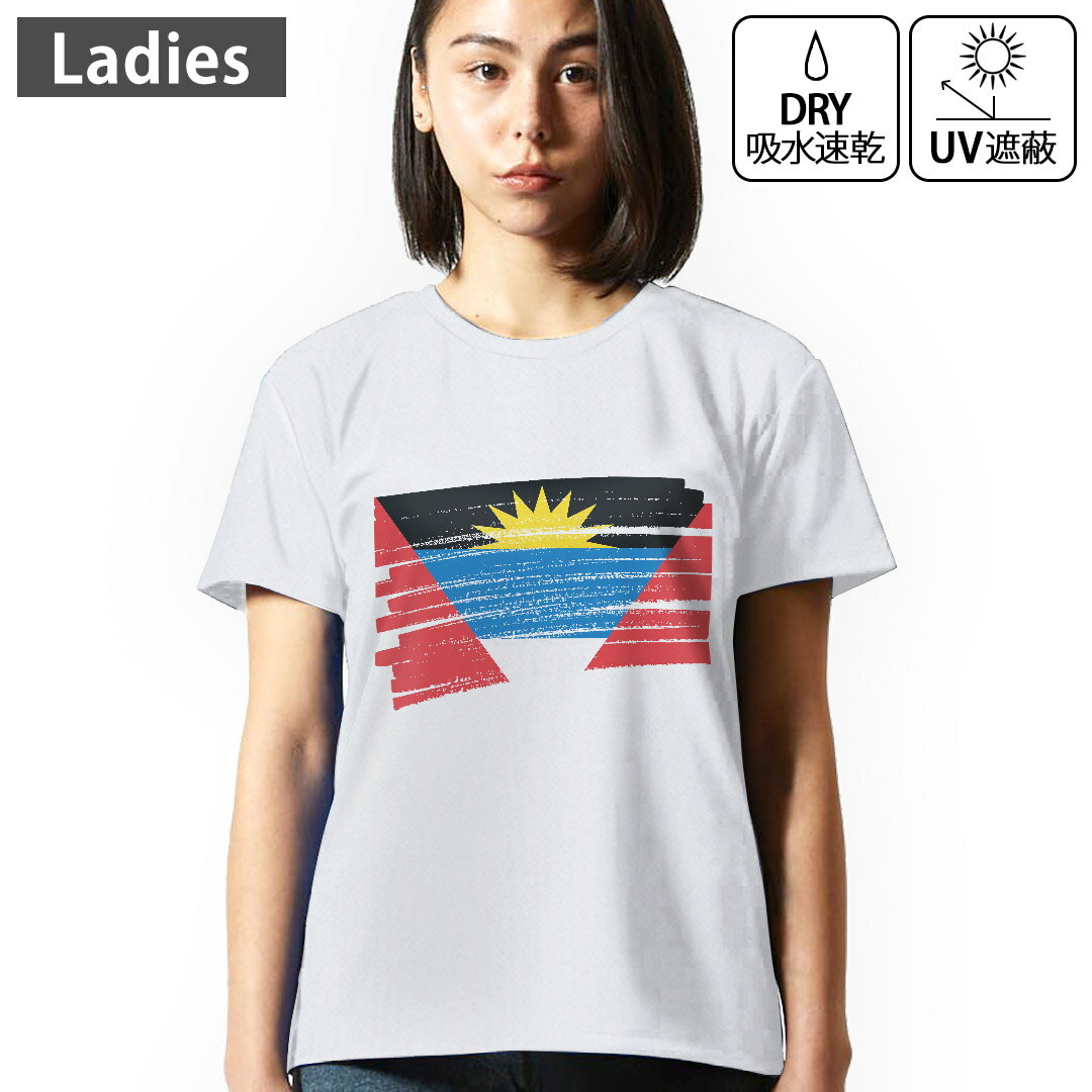 レディース ドライTシャツ ホワイト 半袖 4.1オンス ジム トレーニング スポーツ 運動会 ドライアスレチック UVカット 紫外線遮蔽 吸水速乾 デザイン Tshirt M L 国旗 antigua&barbuda アンティグアバーブーダ 018761
