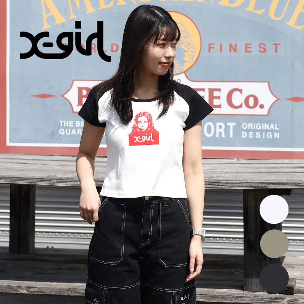 X-girl エックスガール X-girl FACE RAGLAN S/S BABY TEEフェイス ラグラン ショートスリーブ ベビー Tシャツ レディース 春夏 綿 コットン WHITE CHARCOAL BEIGE S M