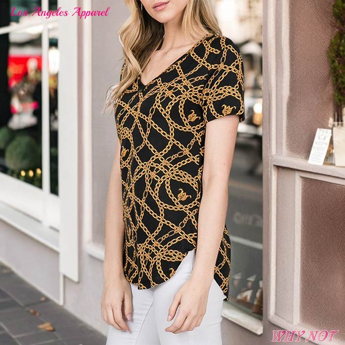 レディース Tシャツ Vネック 半袖 ラウンドヘム チェーン柄 ブラック S.M.L LAインポート MADE IN USA TW230517LA013