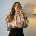 【P2倍&クーポン有】ハイネック ボリューム袖 光沢 トップス レディース ブラウス プルオーバー 白シャツ 白トップス 個性的 春 秋 冬 ミディアム丈 裾イン 長袖 二の腕カバー スタンドカラー スマート 落ち感 透け感 立体的 ハリ感 ブラック 黒 ホワイト 白 ブラウン
