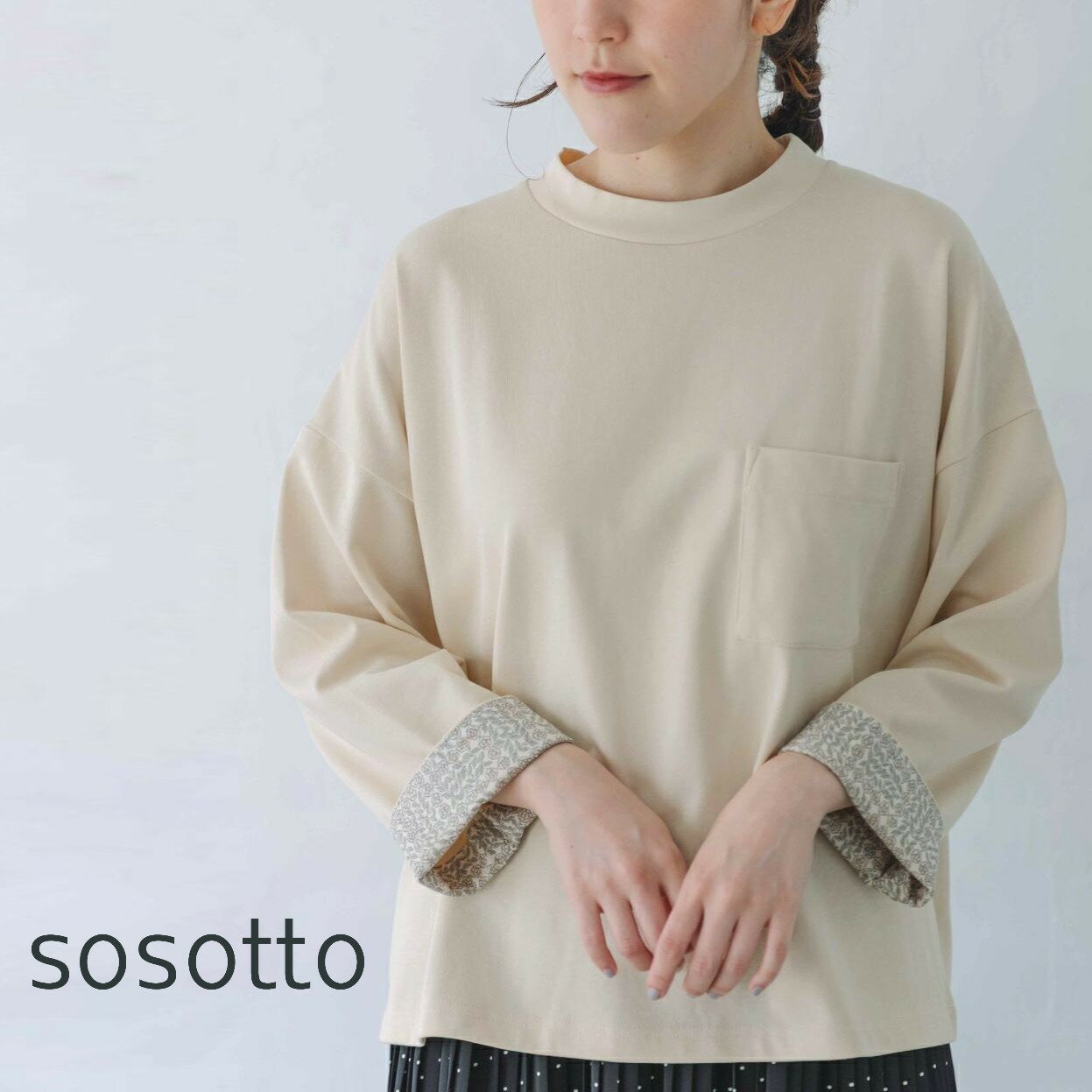 【16%オフ・クーポン対象】sosotto ソソット ロンT カットソー 長袖 ロング Tシャツ 袖口裏 リバティ プリント クルーネック ワイド シルエット ポケット 付き コットン 綿 100% 天竺 2026年春夏物