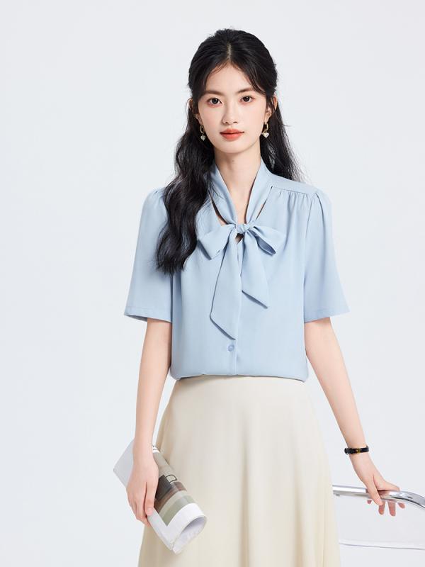 シャツ レディース ブラウス 半袖 セットアップ トップス 春夏 白 ブルー アプリコット 通勤 オフィス ビジネス フォーマル 無地 スカーフカラー ボウタイ スリム ポリエステル 伸縮性 高級感 おしゃれ かわいい きれいめ
