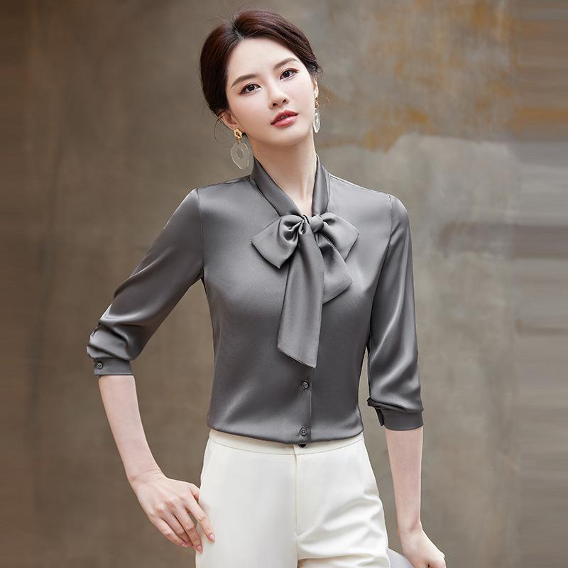 ブラウス レディース 七分袖 シフォン 白 グレー 春夏 通勤 ベーシック 切り替え スカーフカラー 蝶結び ボタン 無地 スリム ミドル丈 ポリエステル 伸縮性 プルオーバー エレガント