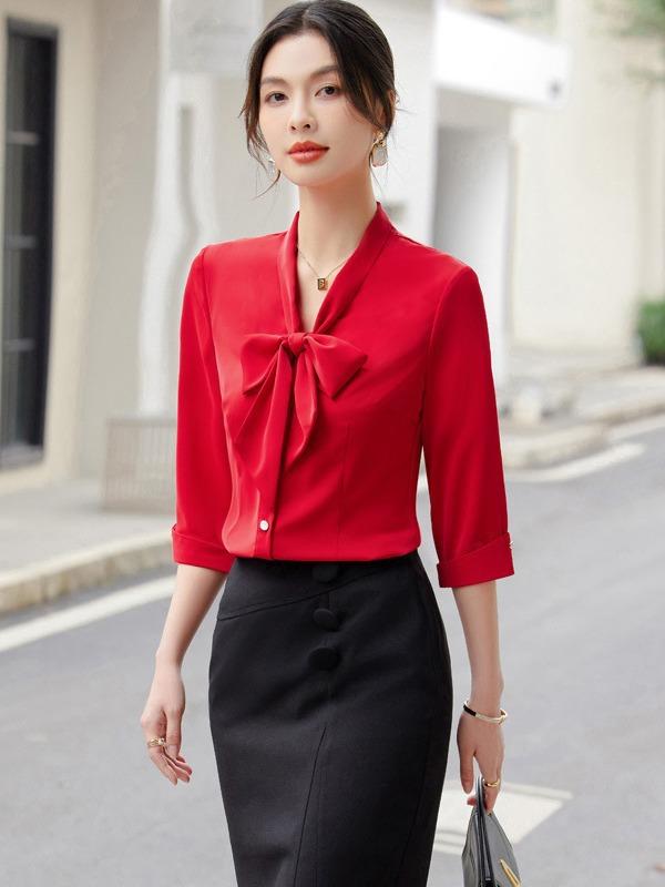 ・カテゴリ: シャツ・仕様: プルオーバー・スタイル: エレガント、通勤・主な素材: ポリエステル 95%以上、ポリウレタン 30%以下・ネックライン: スカーフカラー・袖丈: 七分袖・柄: 無地・フィット感: スリム・カラー展開: レッド、ホワイト、ブルー、ブラック、グリーン・サイズ展開: S、M、L、XL、2XL、3XL、4XL、5XL