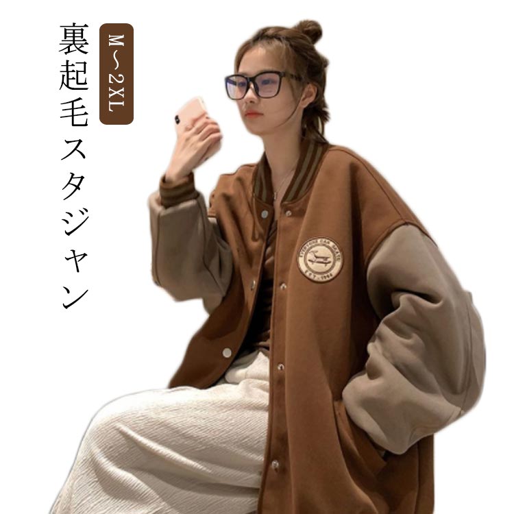 スタジアムジャンパー アウター 厚手 レディース 裏起毛 前開き スタジャン 体型カバー リブ裾 普段着 カジュアル ボタン付き 長袖 トップス ゆったり シンプル 出掛け 秋冬 ジャンパー 通学 ストリート系 ポケット付き