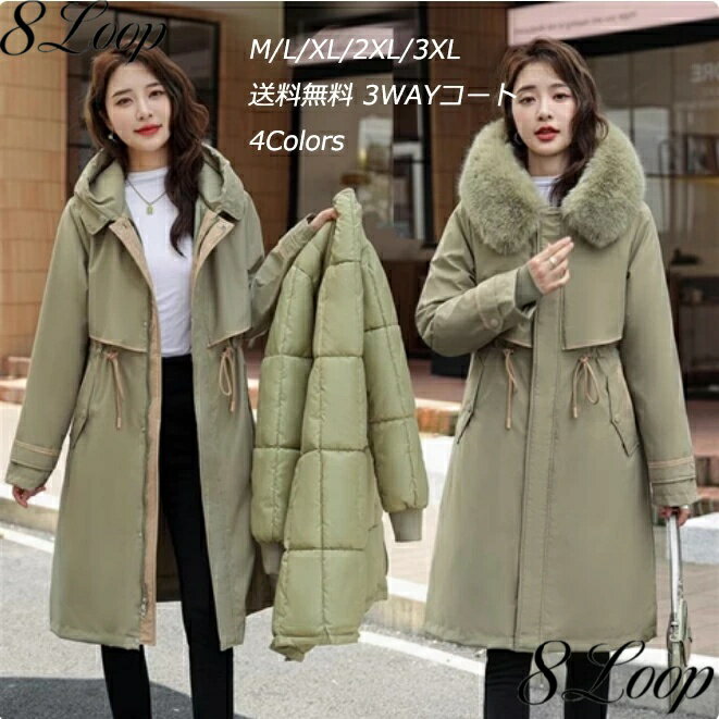 M-4XL ウエスト紐 フェイクファー アウター 袖口リブ 二重構造 ウエスト紐付き ポケット付き 前開き 厚手 取り外し可能 ライナー付き フード付き 厚手 3way ロングコート アウター レディース 中綿コート ダウン風コート スプリングコート トレンチコート 3WAYコート 4色