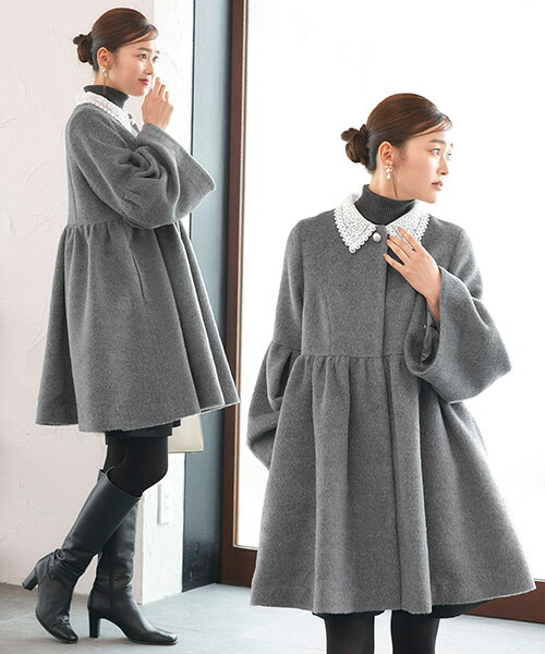 Gray Black Mocha Detail 商品詳細 レース襟付きウールコート(K1611) ふっくらとしたボリューム感がかわいいペプラムコート。 ノーカラーデザインに配色のレース襟がポイント。 襟は取り外し可能な2Way仕様です。 ペプラムの立体フォルムが引き立ち、女性らしいメリハリシルエットを演出します。 取り外し可能な配色のレース襟。 華やかなフレアスリーブがポイント。 【ディテール】 ◆2WAYスタイル 襟は配色のレース襟仕様と、外してシンプルなノーカラーとしても着られる2way仕様です。 シーンやコーデに合わせてアレンジが楽しめます。 ・パール 一番上には飾りパールが付いていてアクセントになっています。 ・ボタン スナップボタンにする事で、きれいめな印象に仕上げています。 ・レース襟 レース襟はボタンで取り外し可能です。 ・ポケット 左右に便利なポケット付き。 ・袖 華やかなフレアスリーブがポイント。 ・ペプラム ハイウエストで切り替えたペプラムデザイン。 体型カバーとスタイルアップを叶えます。 ◆生地 レース襟:花柄模様のケミカルレース ウール混素材:ウールが入った柔らかく毛足のある素材。 【カラーバリエーション】 ・モカ ・グレー ・ブラック ●おすすめシーン デイリーのお出掛けからショッピングはもちろん、通勤やビジネスシーン、結婚式、披露宴、セレモニー、2次会(二次会)、1.5次会、成人式、同窓会、謝恩会、誕生日会、婚活、街コンなどのパーティーシーン、デートや女子会、誕生日会、演奏会、発表会、七五三、お宮参りなど、20代・30代・40代・50代まで幅広いシーンで着用できるコートです。 サイズ サイズ *着丈 バスト ウエスト 肩幅 袖丈 M9号 90 102 94 37.5 58 L11号 91 106 98 38.5 59 *=SNP(ショルダーネックポイント) ■サイズガイド■ 素 材 [表 地] 本 体 : ポリエステル 69% アクリル 19% 毛 12% [襟] レース : ポリエステル 100% オーガンジー : ポリエステル 100% 土台部分 : ポリエステル 100% [裏 地] ポリエステル 100% 商品仕様 ◆伸縮性:なし◆裏地:あり◆開き具:前開きスナップ釦 6セット◆付属品:付け襟(釦で取り外し可) ◆カラー:ブラック/モカ/グレー 備 考 ※商品を平置きにし、メジャーにて手作業による採寸をしております。若干誤差がございます。サイズ等で不明な点はお問い合わせください。 ◆レビューは商品到着後でお願いします。 ■ご利用ガイド■