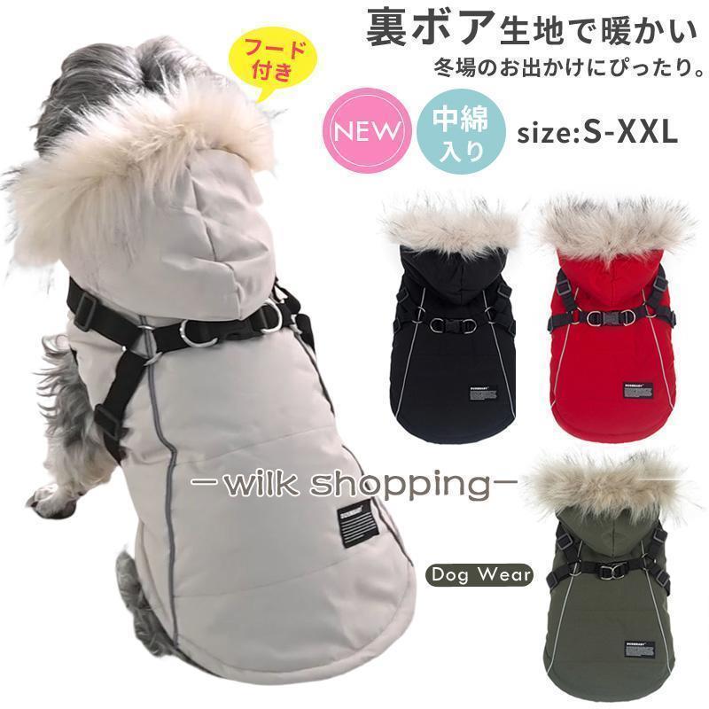 犬 犬服 ハーネス フード付き 防寒 あったか 犬の服 ハーネス一体型ジャンパー コート 中綿入り 裏ボア 小型犬 中型犬 冬服 秋冬 おしゃれ お出かけ