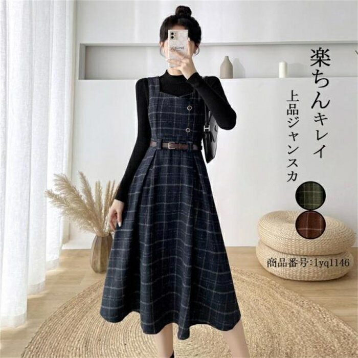 ジャンパースカート 秋冬 サロペット ジャンスカ キャミワンピース レディース キャミワンピ チェック柄 ワンピース 重ね着 可愛い ベルト付き