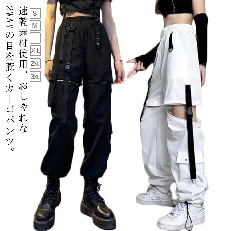 2WAY カーゴパンツ レディース ロングパンツ ズボン ハイウエスト ショートパンツ ワイドパンツ カジュアルパンツ 体型カバー 原宿系 ストリート 韓国風 HIPHOP ダンス衣装 速乾 S M L XL 2XL 3XL