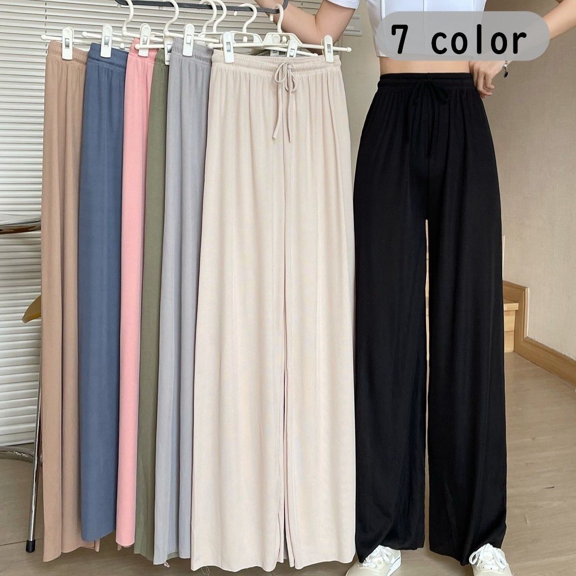 サラサラとして柔らかいストレートワイドパンツ。キレイなラインで脚長効果,ウエストゴムな楽チン。ゆったりとしたシルエットで体型カバーにもおすすめ。※素材ポリエステル95% +ポリウレタン5%生地の厚さ※薄手※商品仕様透け感:ホワイトあり伸縮性:若干あり裏地:なし※(サイズ)ワンサイズFカラー:ブラック/ホワイト/グレー/グリーン/ピンク/ロイヤルブルー総 丈:約93cm ウエスト:約62-90cm(ゴム仕様)ヒップ:約104cm 股上:約32cm 股下:約61cm わたり幅:約30cm裾幅:約26cm※モデルモデルサイズ:身長166cm着用サイズ:Fサイズ全身マネキンサイズ:バスト81cm ウエスト60cm ヒップ85cm着用サイズ:Fサイズ※生産国:中国取扱い表示:水洗い〇/塩素系漂白×/タンブラー乾燥×/アイロン〇/クリーニング〇※すべて平置きサイズです。(計測に付きましては手測りとなりますので 若干の誤差はご了承ください)★商品写真はできる限り実物の色に近づけるよう加工しておりますが、お客様が使用するパソコンのモニター設定や部屋の照明により多少色の変化が感じられる場合がございます。★海外生産のため、縫製の甘い部分や生地の継ぎ目の若干のズレや多少のほつれや形やサイズ に多少の誤差が生じる場合がございます。大量に仕入れている為に商品によってはシワなどが多い場合もございます。また、混紡繊維によって生地の織りに他繊維が混紡している場合もございますが品質上の問題はございません。予めご理解下さいますようお願い致します。★同じ商品でも年中生産していますので“生産時期”や“カラー”により形やサイズ,デザイン,色味に商品画像と“誤差”が生じる場合もございます。ご理解の上ご注文下さい。★実際の色に近づけるため、タグのカラー名称と異なる場合がございます。※十分ご確認の上、ご注文頂きますようお願い申し上げます。返品・交換について購入後の交換は受け付けておりません。予めご了承ください。返品を希望される場合は購入履歴一覧の「ショップへの問い合わせ」よりお問い合わせください。=========================複数配送先指定について1件の注文に対して、異なる住所への配送は対応出来かねます。恐れ入りますが、異なる住所へ配送をご希望の場合、配送先毎に分けて注文いただきますようお願い申し上げます。【パンツ・ズボンWOMEN】ブラック ホワイト グレー グリーン ピンク ロイヤルブルー ワンサイズ