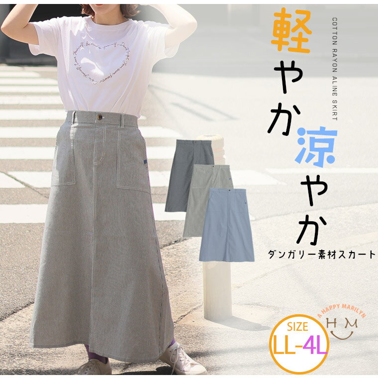 【期間限定クーポン配布】 大きいサイズレディース スカート | さらり楽ちん ダンガリー フレアスカート _ ボトムス デニムスカート LL 3L 4L 夏 お腹 太もも ウエストゴム 下半身カバー カーゴスカート プラスサイズ [145 433095]