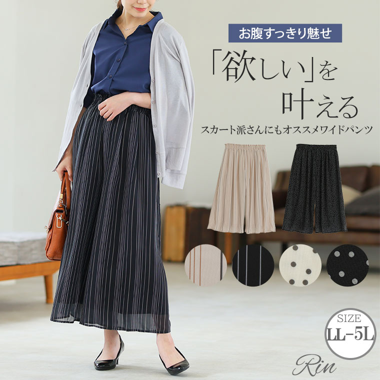 【期間限定クーポン配布】 大きいサイズレディース パンツ | Rin 楽ふわ 脚長美脚 ぽっこりお腹をすっきりカバー タックギャザー シフォンワイドパンツ 柄 ストライプ ドット 水玉 _ ボトムス LL 3L 4L 5L 夏 プラスサイズ [145 443003]