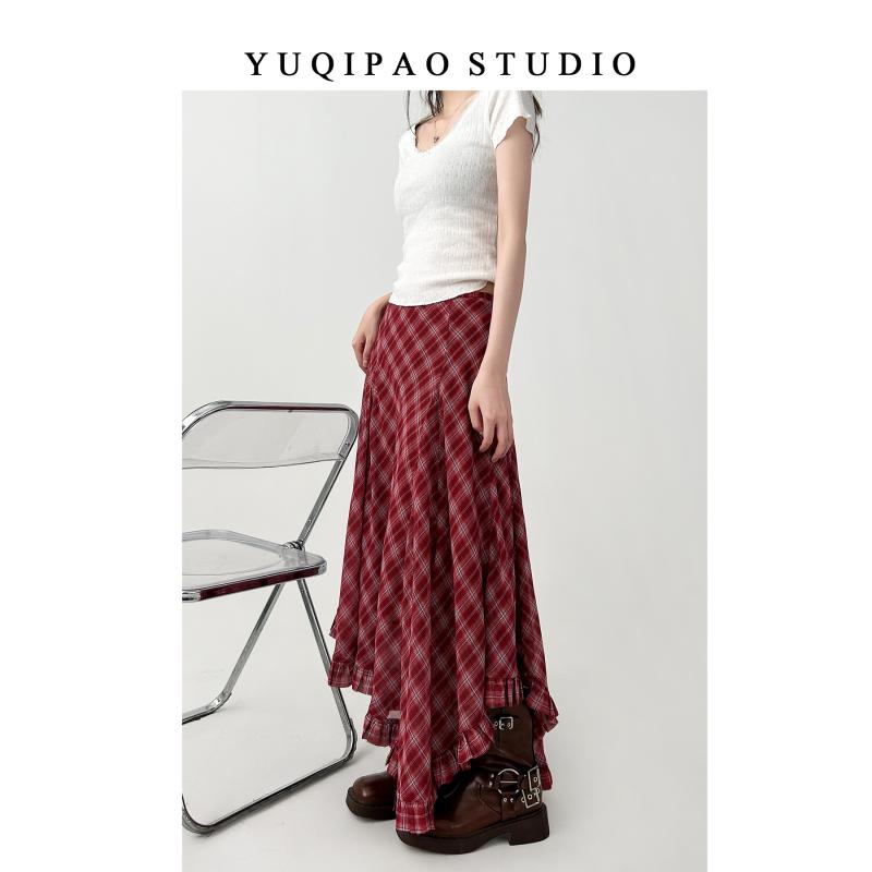 フリル スリットスカート 女性用 レトロ チェック 柄 スカート 2025 春夏 ハイウエスト スリム イヤリング イレギュラー ミディアム 丈