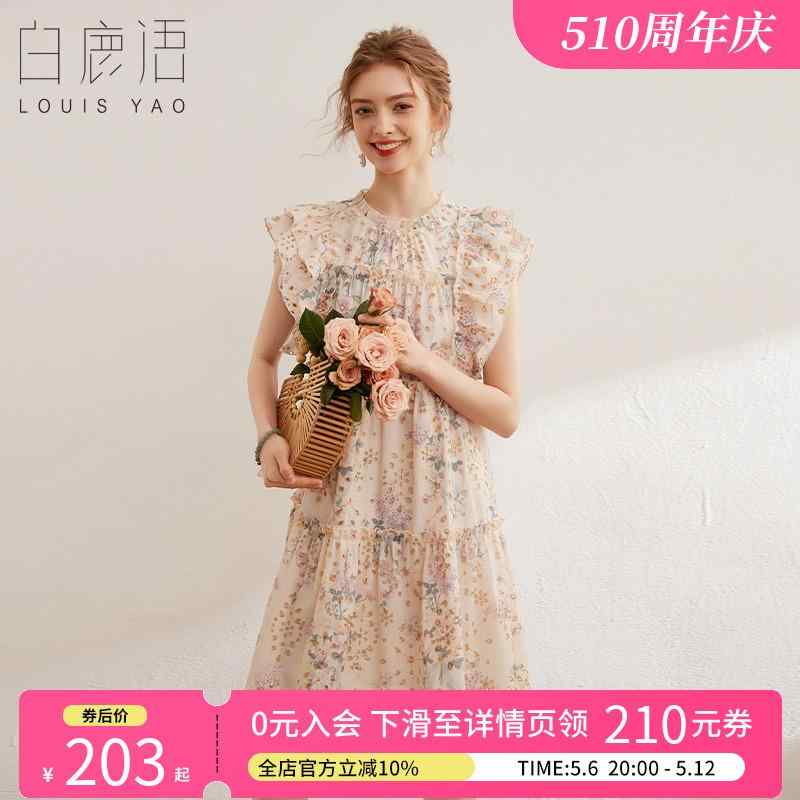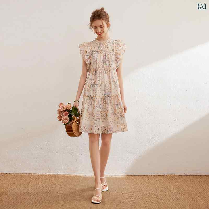 スカート 水玉 レディース Bai Luyu ビーズの イヤリングの 花柄 スカート 夏 ラウンドネック 刺繍 フライング スリーブ ゆったりした 女性用 ドレス