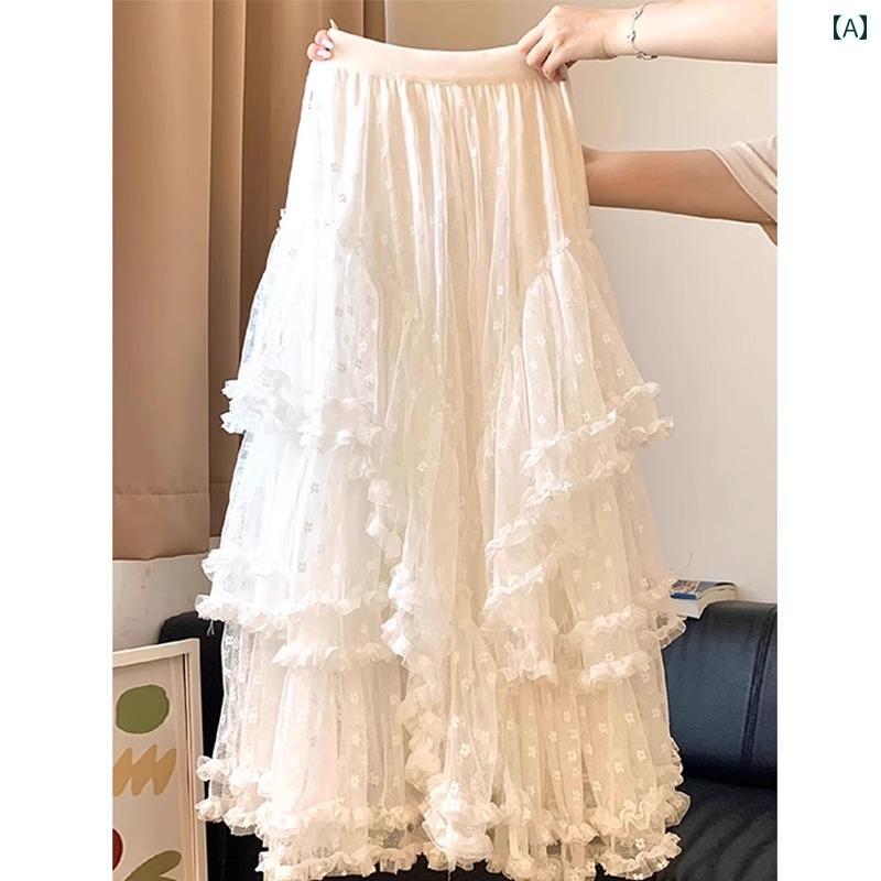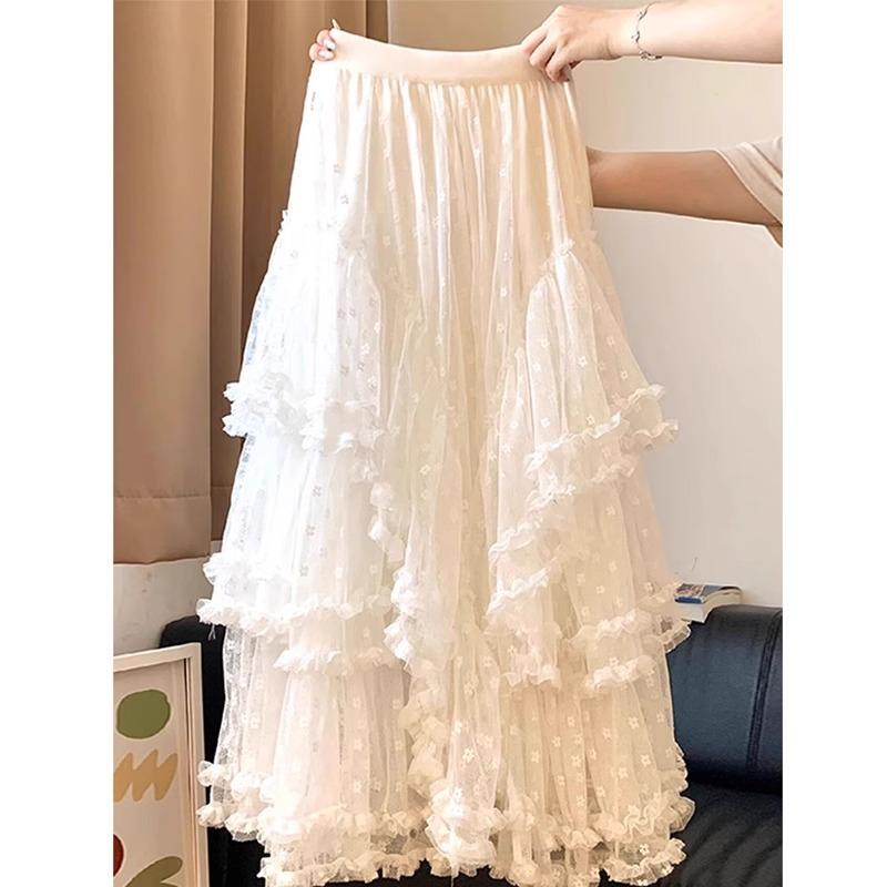 レディース スカート ハイウエスト 太い mm 韓国 重い 弾性 ウエスト レース イヤリング スカート 女性 2025 春秋 フェアリー ロング