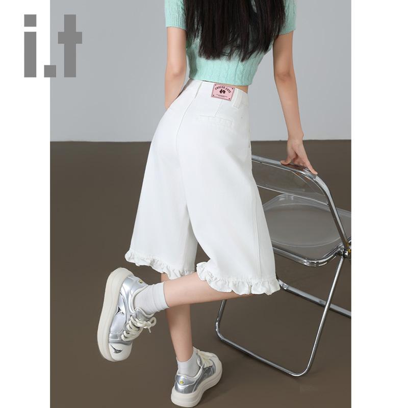 白 ワイドシルエット 裾フリル デニム ショートパンツ レディース 夏物 ハイウエスト 着痩せ効果