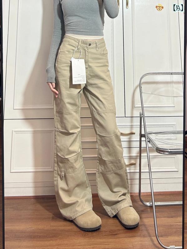レディース デニム 足長 丈が 長めの カーキ ワーク ジーンズ レディース 春 ハイウエスト マイクロフレア ゆったり 和風 レトロ カジュアル パンツ