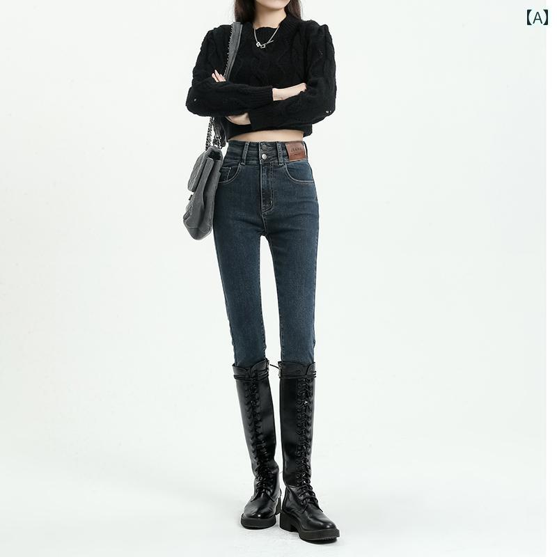 レディース ジーンズ ハイウエスト 女性用 タイト ジーンズ 2025 新 ホット スタイル ブラック 裏起毛 ハイウエスト スリム ペンシル パンツ小 足 パンツ 春秋