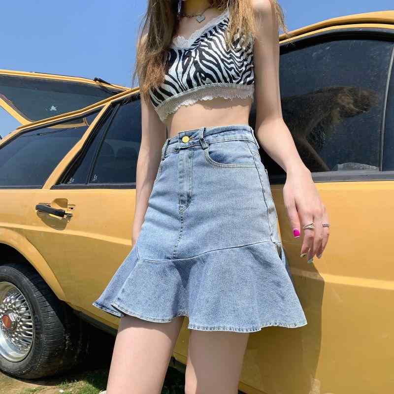 スカート レディース デニム Aラインスカート 膝上丈 2025年 春夏 ハイウエスト 着痩せ タイトスカート マーメイドスカート 裾フリル コットン 浅青色 黒 灰色