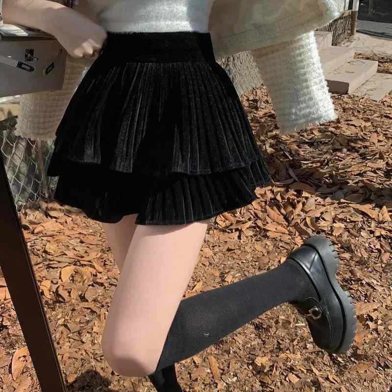 スカート レディース 秋冬 金丝绒 ベロア プリーツ ミニスカート ハイウエスト Aライン フレア 膝上丈 黒 無地 ケーキスカート ギャザー ふんわり かわいい
