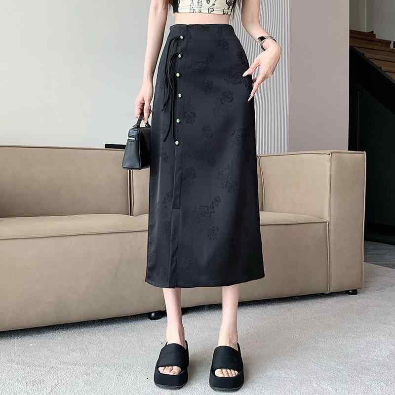 スカート レディース ミモレ丈 ロング丈 春夏 レトロ チャイナ風 ベルベット Aライン スリット ブラック