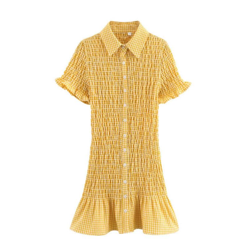 ・柄: 格子柄・スタイル: 欧美風・カテゴリ: ワンピース・素材: ポリエステル・袖丈: 半袖・ネックライン: シャツ襟・シルエット: 基本・スカート丈: ミモレ丈・スカート型: 切り替え・ウエスト: ゆったり・カラー: 画像色・サイズ: XS, S, M, L・主な素材含有量: 95%以上