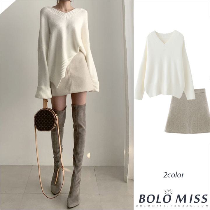 【バラ売り】Vネックセーター Aラインウールスカート ニット セーター ミニスカート ハイウエスト ウールスカート 秋冬 a3869