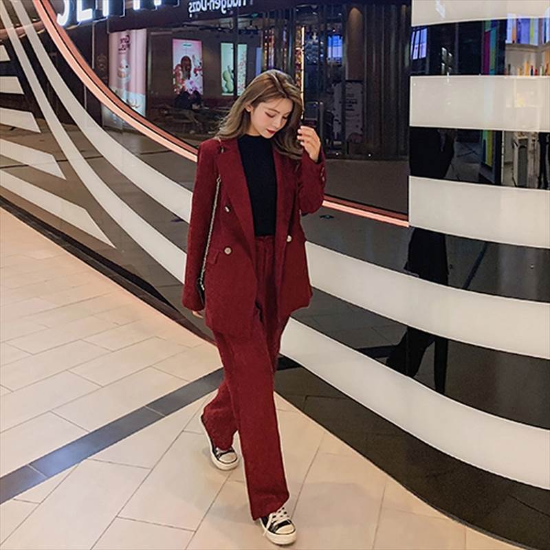 セットアップ ジャケット パンツ ロング丈 長袖 Vネック 襟付き ストレート ワイド ポケット ハイウエスト 前開き ウエストゴム ボタン コーデュロイ ツーピース 送料無料 個性的 S M L XL ワインレッド かわいい おしゃれ かっこいい セットアップ 無地 秋 冬 レディース