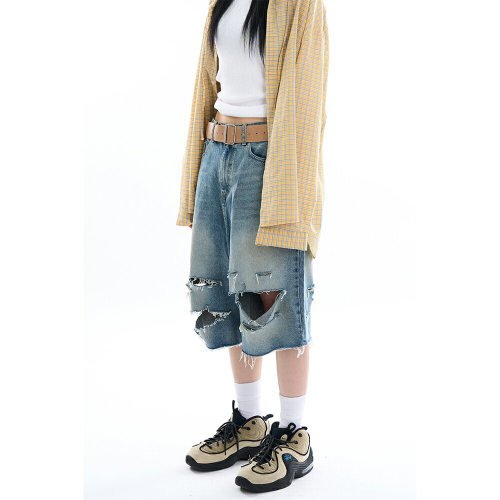 【送料無料】ラウコハウス【Raucohouse】Spot destroyed bermuda denim pants / スポットデストロイドバミューダデニムパンツ 男女兼用【公式ショップ】