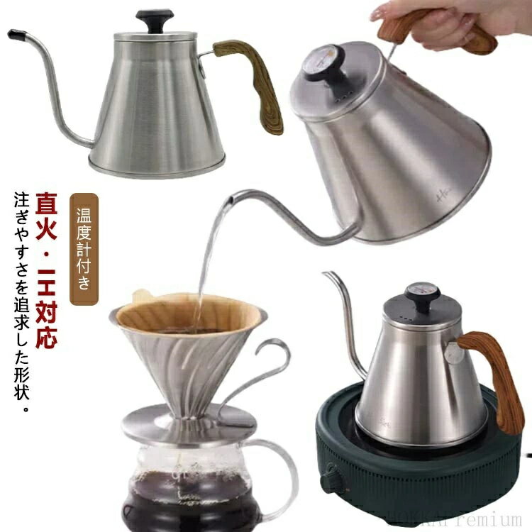 ドリップケトル目盛付き コーヒーポット コーヒーケトル 細口ポット ス 対応 天然木柄 直火 蓋付き 1リットル IH コーヒーポット