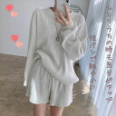 【P2倍&クーポン有】ルームウェア ショートパンツ セットアップ 部屋着 春 夏 秋 冬 ミニ 長丈トップス お尻カバー 裾イン 長袖 クルーネック 丸首 ラウンドネック ノーカラー セミフレア ハイウエスト 落ち感 リボン ウエスト 伸縮性 ホワイト 無地 ゆったり リブ