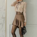 【P2倍&クーポン有】フリル アシンメトリー リボン シアー ボタン トップス スカート セットアップ 上下セット レディース シャツ 台形 個性的 春 夏 秋 冬 オールシーズン ミニ 裾イン 長袖 ハイネック スタンドカラー タイト 細身 ハイウエスト 立体的 ハリ感 茶色
