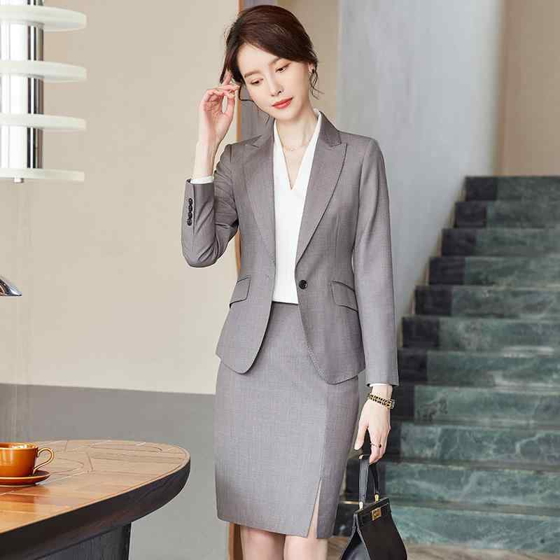 スーツ レディース 女性用 3つボタン テーラードジャケット スカート セットアップ オフィス ビジネス 制服 ユニフォーム 事務服 受付 宝石店 美容院 ホテル フロント 接客 サービス業 グレー ポリエステル 秋冬