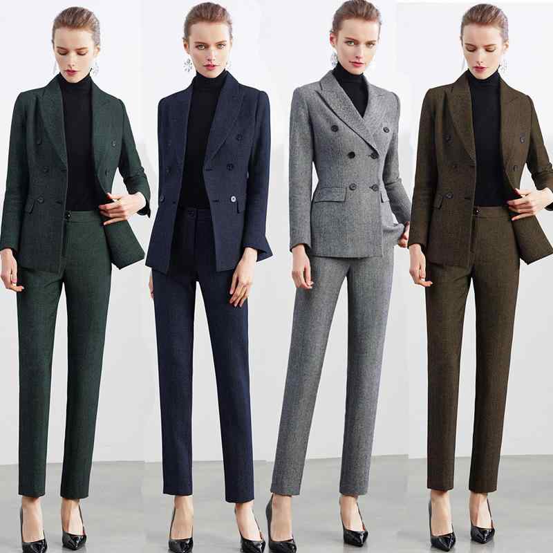 スーツ レディース 秋冬 ダブルブレスト 高級感 ウール混紡 テーラードジャケット パンツまたはスカート セットアップ OL オフィス フォーマル 紺色 墨緑色 茶色 グレー