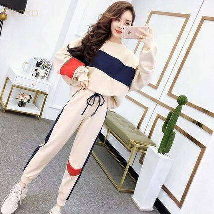 セットアップ ルームウェア レディース 個性的 トレーナー スウェット 2点セット ジャージ 部屋着 裏起毛 ジョガー パンツ ロング丈 長袖 ラウンドネック 春 秋 襟なし ウエストゴム 伸縮性 スポーティーきれいめ カジュアル おしゃれ トリコロール アプリコット ネイビー