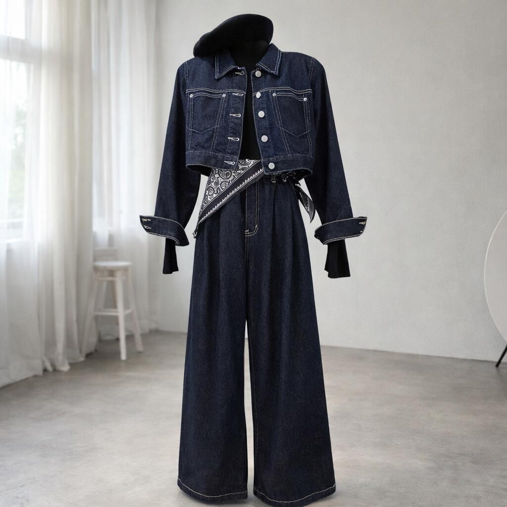 【2/24春節明け順次発送!】【9980円→7,984円20%クーポン!】デニムセットアップ レディース セットアップ レディース ショート デニムジャケット バックスリット ワイドパンツ 上下セット スカーフ付き インディゴカラー 韓国ストリート 韓国 新作 20代 30代 40代 CO5355