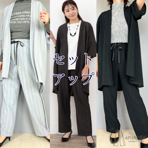 トップス サイズ単位(cm)フリーバスト108着丈86肩幅40袖丈35袖口42裾まわり(直線)150※測定方法によっても誤差が生じますので、予めご了承下さい。パンツ サイズ単位(cm)MLLL総丈969696ウエスト67~7272~7777~82ヒップ96100103股上303030股下666666渡巾323334膝巾2525.526裾巾2222.523※測定方法によっても誤差が生じますので、予めご了承下さい。それぞれ単体でもご購入頂けます。素材ポリエステル 96%ポリウレタン 4%裏地なし生地の伸縮あり透け感ありカラーグレー チャ クロ 全3色生地の厚さ厚い〇〇〇〇●薄い光沢なし洗濯手洗いできます。商品説明ジャガードニット素材が涼やかな印象に。レースのようなお洒落な素材感です。透け感のある五分袖カーディガンです。さっと羽織るだけで気になる二の腕やお腹周りをカバーできます。ロング丈なのでヒップ周りも隠せます。パンツは同色を使い、サイドにラインを入れることでスッキリとした印象に。カジュアルでありながら上品なスタイルになります。ウエストは総ゴムでお腹周りも楽ちんです。パンツは裏地付きです。イージーパンツオフィス 発表会 入学式 卒業式 女子会 パーティネックレスやパンプスを合わせればセレモニースタイルが完成。ジャケットをプラスしたりトップスとボトムスを単体で着たりと組み合わせい次第で幅広いコーディネートが楽しめます。中国製。注意事項この商品は糸及び編み組織の性質上、引っかけ・引っかかりやすい性質をもっております。着脱時には下記の点に十分ご注意下さい。●着用時にベルト・バック・アクセサリー・周囲の壁など、表面の粗いものとの摩擦や、引っかかりにご注意下さい。●水洗いや、クリーニングの際にも、他のものとの引っかかりにご注意下さい。●クリーニングの際は、取り扱い絵表示をご確認の上お願いいたします。●モニターの色と実際の色が異なることがございます。あらかじめご了承ください。●お客様都合による返品交換は受け付けておりません。あらかじめご了承ください。※予め十分ご確認の上、ご注文頂きますようお願い申し上げます。