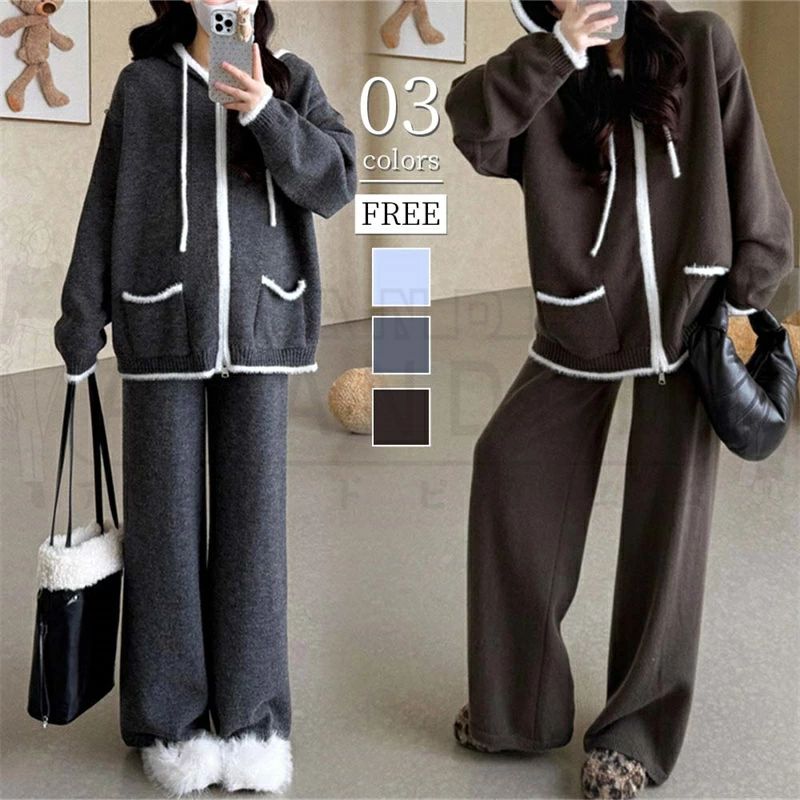 ニット セットアップ 秋 冬 レディース ニット パンツスーツ 上下セット 長袖 セーター フード付きニットパーカー ダブルジップ 2点セット キレイめ 優雅 セット ロングパンツ おしゃれ カジュアル 通勤 OL 体型カバー 着痩せ 無地 オフィス ゆったり 送料無料