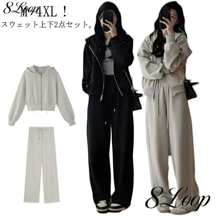 スウェット セットアップ レディース フード付き 長袖 パーカー ワイドパンツ 2点セット 綿 ジャージ 上下セット 春 秋 冬 カジュアル ロングパンツ 着痩せ 部屋着 ルームウェア 韓国ファッション スポーツ 運動着 大人可愛い 大きいサイズ 送料無料
