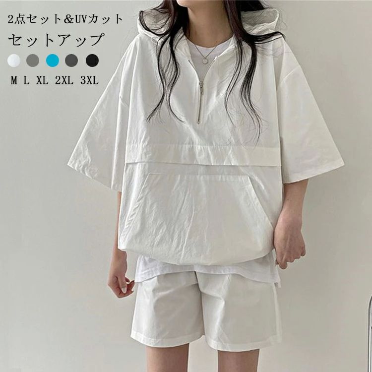 セットアップ パーカー ショートパンツ レディース 夏 日焼け止め トップス パンツ 半袖 短ズボン 上下セット 2点セット ウエストゴム フード付き ポケット ジップアップ ハーフジップ スポーティー ゆったり 体型カバー 可愛い 楽ちん 通勤 春夏 大人