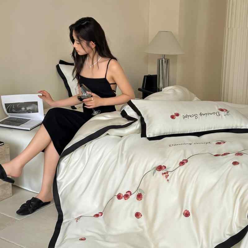 ・染色加工: 活性染色・織り加工: 刺繍・柄: 楊梅熟了-梅子色,楊梅熟了-月光白・サイズ: 1.5mベッドシーツ4点セット,1.8mベッドシーツ4点セット,2.0mベッドシーツ4点セット・素材: リヨセル・スタイル: モダンシンプル・種類: 4点セット