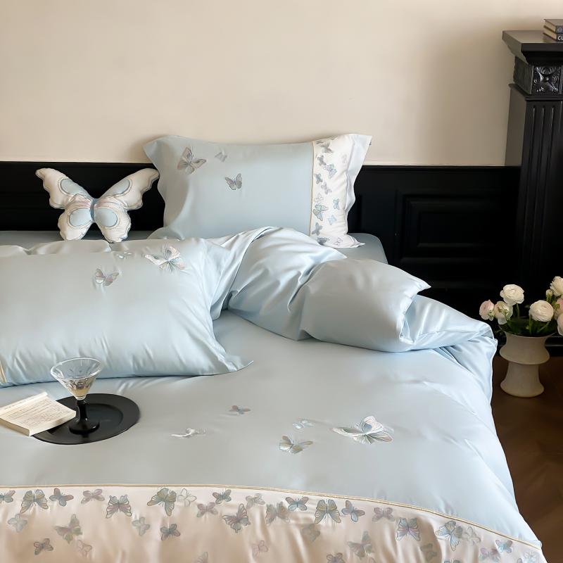 寝具4点セット テンセル素材 刺繍デザイン 楊梅柄 高級感 軽やか 吸湿速乾 再生繊維 寝室用 通年対応 快適 ナチュラル スタイリッシュ ベッドリネン シーツ カバー 枕カバー セット 花柄 モダン インテリア