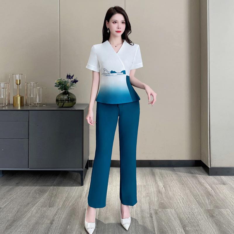 セットアップ レディース ストレッチ 美容師 エステティシャン セラピスト 制服 ユニフォーム 3分袖 9分丈パンツ スパ サロン フットケア 高級感 上品 ポリエステル ブルー