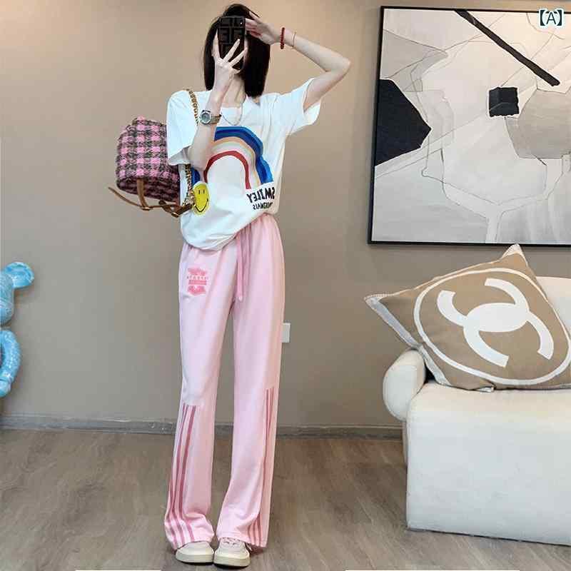 レディース カジュアル ウェア 夏の 女性用 ピンクの スポーツ スーツ ゆったり カジュアル スタイル リラックス した 感じ 半袖 Tシャツ ロング パンツ 綿 ツーピース