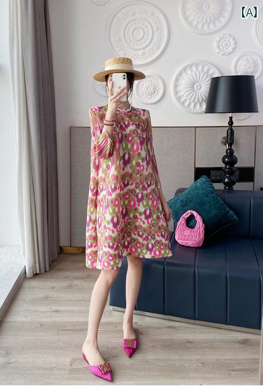レディース ワンピース かわいい 大きいサイズ プリーツ チャイナ ドレス チャイナ風 プリント ミドル 丈 スカート ハイエンドの ゆったり 母親の 服装