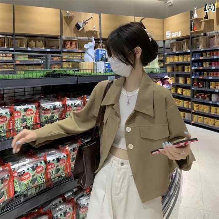 ジャケット レディース ショート丈 長袖 ポロ襟 薄手 春秋 クラシック レトロ 小柄 低身長向け オフィス カジュアル アウター カーキ