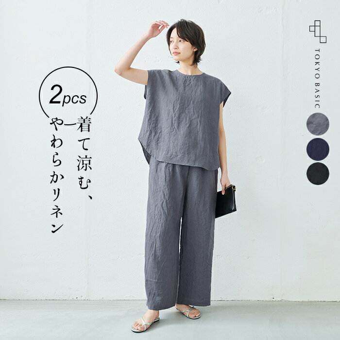 [ セットアップ レディース カジュアル 夏 ] 40番手 フレンチリネン100% Tブラウス + ワイドパンツ 2点セット / 日本製 40代 50代 ファッション 麻100 リネン100% 涼しい 速乾 抗菌 リラックスウェア ラフ 楽ちん