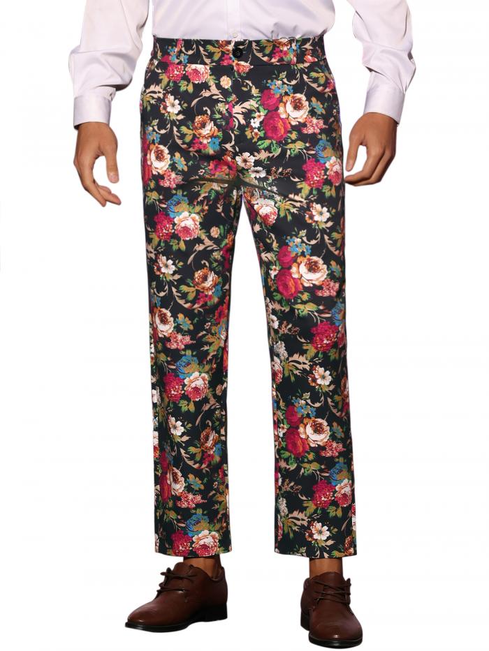 Lars Amadeus 花柄ペインティング フローラル ドレスパンツ フラットフロント パーティー プロム フラワー プリント スラックス メンズ ブラックレッド 28