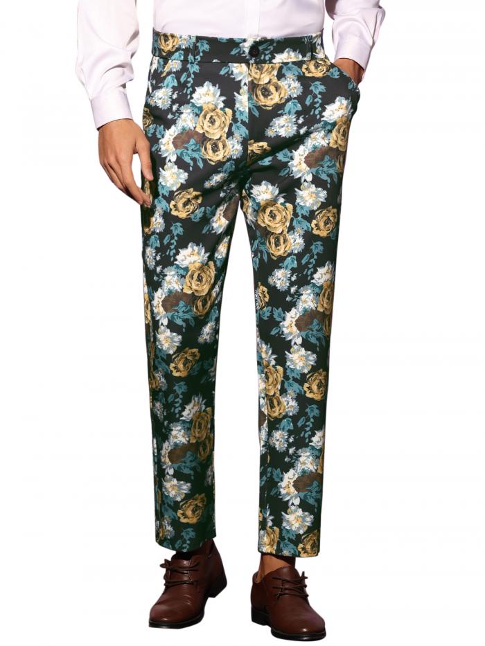 Lars Amadeus 花柄ペインティング フローラル ドレスパンツ フラットフロント パーティー プロム フラワー プリント スラックス メンズ グリーンピンク 28